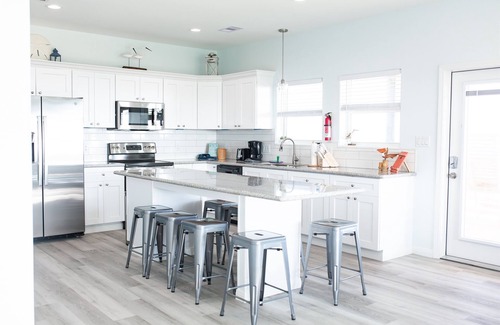 The kitchen is fully equipped with stainless steel appliances, granite countertops, and a large island that can accommodate up to 8 guests. You'll find the cabinets well-stocked with everything you need to enjoy a family vacation whether you want to boil some local seafood or just enjoy the sunset with a frozen beverage.