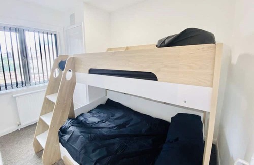 The cottage is spacious downstairs, with a lovely little paved suntrap garden. Upstairs there is a large main bedroom with double bed, & a smaller 2nd bedroom with a double & single bunks large enough for 3 kids.