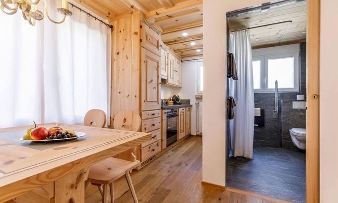 Newly renovated in 2017, the house presents itself in a unique Grisons style, very well maintained and optimally tailored to the needs of holiday apartment guests. Inside, the studio is lovingly furnished with lots of local wood. The floors are covered with fine parquet and the bathroom shines with high-quality Vals quartzite tiles. The kitchen also impresses with its solid wood furnishings and offers everything you need to be creative on holiday.