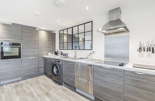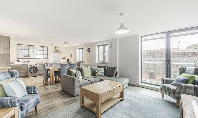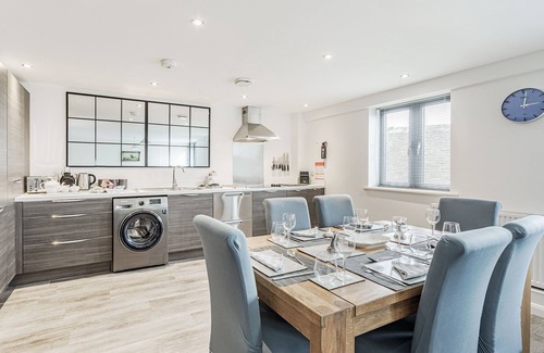 Bathroom 1: Bath With Shower Over Bath, Heated Towel Rail, Toilet. Gas central heating, electricity, bed linen, towels and Wi-Fi included. Welcome pack. . Private underground parking for 1 car. No smoking. . Part of an original working Malthouse, this historical building has been converted into a collection of elegant apartments which ooze charm and character at every turn. Alnwick Pad is an upper ground floor apartment, accessed by a lift or stairs. The apartment opens into a hallway, the spacious open plan living area making a fabulous social space. With modern style kitchen superbly equipped, dining area with quirky champagne bar and stools, leading to the comfortable and stylish living space decorated in blues and greys. The master bedroom has a sumptuous super kingsiz bed which can be twin beds on request, Smart TV and en-suite shower room. The second bedroom is super king, and for flexibility can also be twin beds on request.