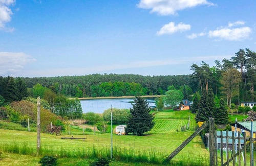 One of two separate holiday apartments in a holiday home on the owner's large residential/lake property. The lake with private jetty and rowing boat is approx. 200 m away, the public bathing area approx. 800 m (with boat approx. 400 m). For this accommodation unit are available: WLAN, sun loungers, terrace, barbecue, small children's playground with trampoline and swings and car park, rowing boat by arrangement. A travel cot and high chair are available for small children.