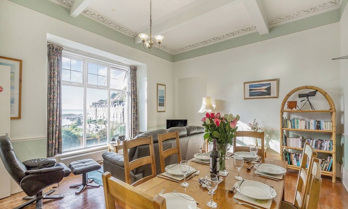 Bathroom: Bath With Shower Over, Heated Towel Rail, Toilet. Gas central heating, electricity, bed linen, towels and Wi-Fi included. Highchair. . Garden with sitting out area and garden furniture. Children’s play area (shared with other properties on-site). Sea fishing on-site. Private parking for 2 cars. No smoking. Please note: There are 18 steps in garden. May not be suitable for guests with walking difficulties.. This traditional Georgian ground floor seaside apartment in an elevated position is full of character and has a very desirable location right on the edge of Barmouth. Barmouth is a very lively spot with its cafés, pubs, shops, museums, galleries, harbour, sea and miles of golden sandy beach. With endless amounts of beautiful views over the estuary and across to Cader Idris Mountain range which can be enjoyed from either the living room or the secret shared garden located on top of the steep hill behind the house just a short walk away; it is breath taking.