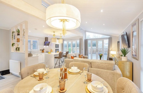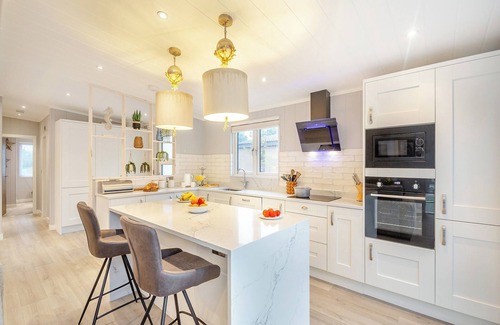 The lodge boasts two spacious bedrooms, each adorned with plush linens and a harmonious blend of contemporary and cosy furnishings. The master suite features a king-sized bed with en suite shower room, while the second bedroom offers twin beds. A separate family bathroom with bathtub, providing a perfect haven for families or couples seeking a romantic getaway. The open-plan living area is an inviting social sanctuary. With sumptuous sofas in the living area, the dining area is elegantly set for four with romantic light fittings, perfect for enjoying meals prepared in the fully equipped modern kitchen.