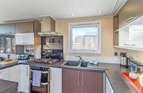 Ideal for family getaways, this contemporary 12ft-wide wood effect holiday home boasts a sunken outdoor hot tub on the decking area. The master double has a walk-in wardrobe and contemporary styled en suite bathroom, and there is a further twin (2ft 6in wide beds) with use of a shower. The stylish and spacious open-plan living space leads to decking for al fresco dining and comprises a modern kitchen, breakfast bar, dining area and living area. Pets allowed in selected accommodation only.