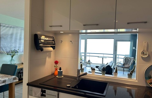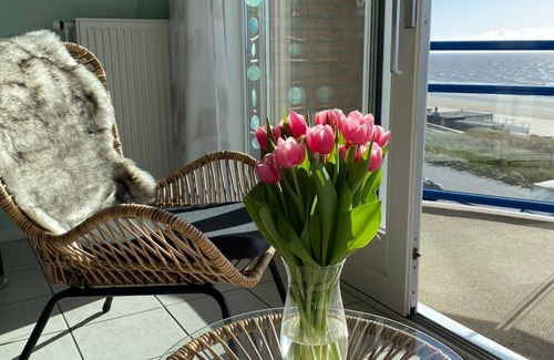 From the hall, where the guest toilet and a built-in wardrobe are located, you walk through to the living room with open kitchen. The living room has ample seating, a dining area and digital television (Smart TV with Chromecast). A sliding door provides access to the balcony with awning. Enjoy the beautiful view of the sea and the pleasant atmosphere of the beachgoers. From the balcony you can enjoy the beautiful sunset and views.