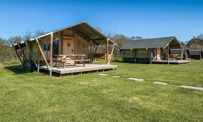 The Hall More Safari Tents provide a unique holiday experience and offer great enjoyment for all the family. This spacious safari tent has one double bedroom and one bedroom with bunk beds. The open planned living area is spacious and includes a dining table, as well as a small kitchenette that provides a fridge, 2-hob gas burner, washing up sink and a kettle, allowing you to rustle up a family meal or a lovely breakfast before a day out exploring. There is also a decking area under a covered terrace with outdoor furniture for you to sit and enjoy the sun with a cuppa. . For those wishing to escape from it all and enjoy a quiet and peaceful break, then Hall More is the perfect location. Set amongst 10 acres of woodland and in an Area of Outstanding Natural Beauty, you’ll be able to relax and kick back whilst also enjoying the various walks and wonderful wildlife that is within your fingertips.