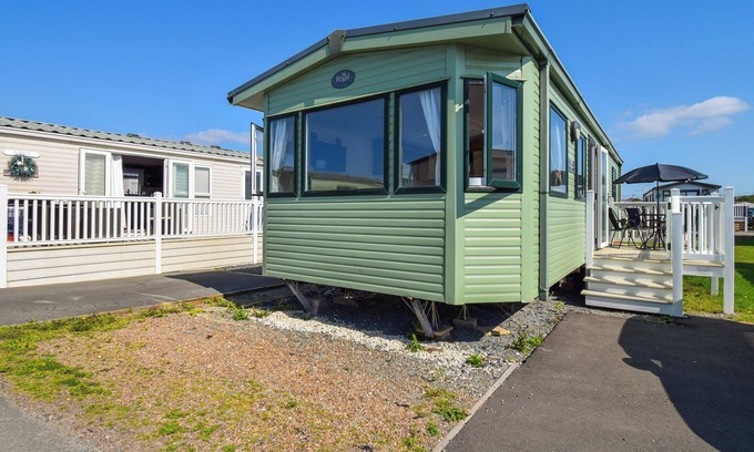 Coastal static caravan at Ocean’s Edge that boasts fantastic sea views, outdoor seating, and on-site facilities.. 4 steps to entrance.