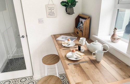 Fully refurbished in 2021, providing stylish and spacious accommodation, is decorated throughout in a calming colour palette and furnished for your comfort and relaxation. The living area is inviting and spacious, comfortably accommodating guests with a modern flicker flame fire. The separate dining room has a cosy nook with comfy chairs, and a large table, whether you are gathering for a hearty breakfast or celebratory supper. The modern gloss kitchen is well-equipped to cater to all your needs. The fun starts outside with an enclosed courtyard garden set with tables and chairs for summer dining and a fabulous bubbling hot tub which is sure to be a winner! Perfect to return to after a day exploring, so grab your costume and enjoy a dip as the sun goes down. Off to bed and upstairs are two bedrooms and a family bathroom. The spacious master bedroom has a kingsize bed. The second bedroom is a comfortable double. The family bathroom has a bath with a shower over.