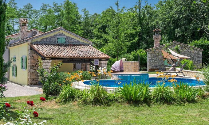 The house was built at the end of the 19th century and renovated in 2004. During the reconstruction of the house traditional materials were used to preserve its originality so the guests can enjoy life as it once was in an Istrian home, of course with all the benefits of a modern holiday home. Situated on an garden of 20.000 sqm with a vineyard and numerous fruit trees it offers a 32 sqm open pool with sun chairs, barbecue fireplace, covered terrace with dining facilities, a terrace covered with a vine, a konoba (typical Istrian tavern) and a parking space. The house owner does not live on the property and the other half of the house is for rent also.