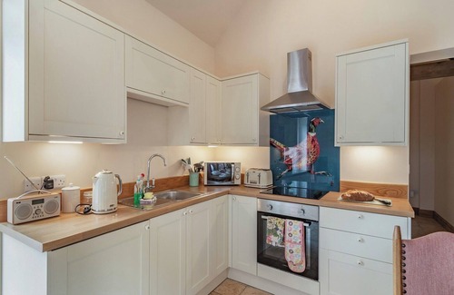 Bathroom: With shower over bath, toilet and heated towel rail.. Air source heat pump underfloor central heating, electricity, bed linen, towels and Wi-Fi included. Travel cot and highchair. Enclosed back garden with patio, barbecue and garden furniture. Electric vehicle charging point, by prior arrangement. Private parking for 1 car. No smoking. . The Stables is a brand new spacious two-bedroom barn conversion finished to a high standard. This single-storey property with open-plan living space combines modern convenience with traditional charm, with vaulted ceilings and beautiful oak beams and the comfort of underfloor heating. With doors opening out onto a lovely private garden with a patio and a large lawned area perfect for family gatherings and summer games. Guests will love the peace and tranquillity of the area, situated in a quiet country lane, the accommodation is within walking distance of Sedgefield with a pretty village green at its centre, it boasts an excellent choice of pubs, restaurants, tea rooms, and independent shops.