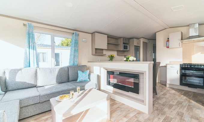 A contemporary 12ft-wide caravan making a great base for a family holiday, featuring one comfortable double with en suite toilet and one cosy twin, along with a modern family shower room. The stylish open-plan living area is spacious, with living area Flatscreen TV, comfy sofas and fireplace with electric fire, modern well-equipped kitchen with freestanding fridge/freezer and dining area. Pets allowed in selected accommodation only.