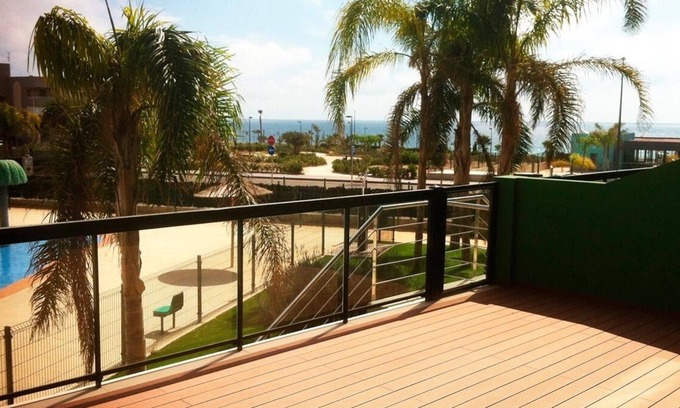 It is an apartment located on the ground floor with 47m2 terrace and with direct access to the swimming pools. Although it is elevated about 2 meters from the ground level so it has magnificent views of the sea and maintains its privacy. It is located in C / Tabarca, nº 14 - Torre de la Horadada (Alicante) on the 1st line of the sea. It has living room, kitchen, 2 bedrooms (marriage + 2 beds), 2 bathrooms, smooth paint, air conditioning ducts, steel-stainless steel appliances, dishwasher, washing machine, dryer, Wifi 12 Megas, German television Astra 19. 2 ... Terrace of 47m. It includes linen and towels.