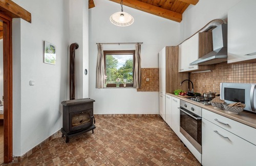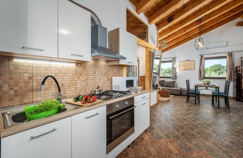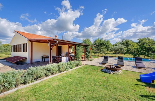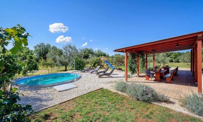This idyllic vacation home is located in the small village of Valtura and thanks to its location far from any mass tourism and stress, it allows you to spend a relaxing vacation. Surrounded by olive trees, you can relax by the swimming pool and enjoy the sun. The rustic interior decoration was chosen with care. There is a 200 m long unpaved road leading to the vacation property. In the vicinity there are horse riding facilities as well as the adrenaline park Glavani, which offers a varied program for young and old. We recommend a visit to the Roman city of Pula, which attracts with its amphitheater.