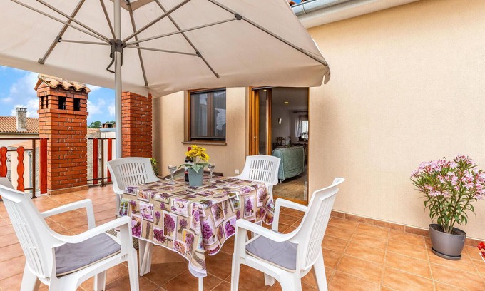 This spacious vacation apartment is located in a family house and offers a nice setting for a relaxing vacation. The interiors are very pleasantly furnished and equipped. The spacious terrace invites you to relax. Beautiful city beaches are only a few minutes away by car. The choice of sightseeing, culture, sports, various events and concerts in Pula is wide and surely there is a suitable leisure activity for everyone! We can only recommend trips to Rovinj, Porec or the Brijuni National Park.