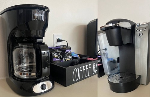 The fully equipped kitchen features an oven, stove, microwave, refrigerator, and all the basics for meal prep and dining and two coffee pots, a drip and Keurig- with coffee provided. The adjacent dining space comfortably accommodates your group for shared meals or games.