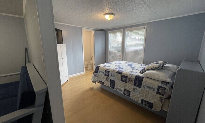 Cabin 6 has separate sleeping areas with two rooms each with a full size bed. Equipped with a kitchenette with an electric stove, microwave, and refrigerator, full bathroom with shower, and DISH, your relaxing stay is just a few clicks away.