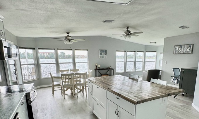 The kitchen/great room, sunroom and rear covered patio and raised deck area have direct and uninterrupted views of raccoon lake (some 70+ acres big) where you can watch the sun rise in the morning, fish all day, watch people at play on the water during the day or just sit and watch the various wildlife. In the evenings, you can enjoy your own personal view of the firework displays across the lake from 3 of the Disney parks.