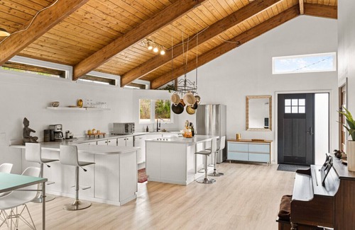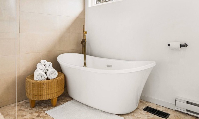 This beautifully designed 2-bedroom home features an open-concept layout with spacious living areas and modern finishes throughout. A striking wooden ceiling and warm wood accents add character to the modern aesthetic. The spa-inspired bathroom includes a unique rock floor, a free-standing soaking tub, and a glass shower, creating a luxurious retreat. Clean lines, natural textures, and thoughtful design make this home both stylish and comfortable.