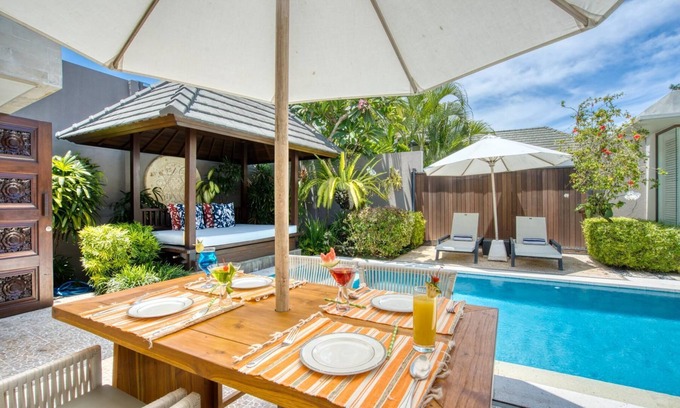 The centerpiece is a glistening private pool, surrounded by comfortable sun loungers, perfect for soaking up the Balinese sun. The outdoor space is designed for relaxation, featuring a shaded gazebo where you can unwind with a book or enjoy a refreshing drink.