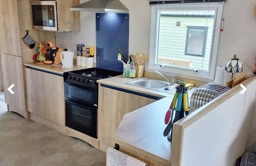Lovely welcoming caravan with freestanding furniture, an outside eating area with picnic table. 43in LG Tv and WiFi. Well decorated with brightly coloured crockery sets and bedding giving it a real holiday vibe, Steam Punk lighting in all rooms