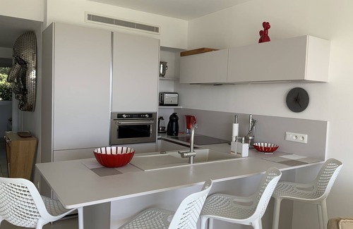 Contemporary apartment entirely renovated T3 of 54m2 with magnificent panoramic sea view, terrace and parking. Semi-Olympic swimming pool with deckchairs and parasols available, tennis court and table tennis.