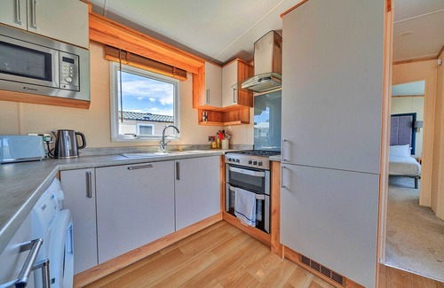 This charming mobile home, located on the peaceful Wilksworth Caravan Park, offers a delightful base for a relaxing holiday in the heart of the countryside. A part of the award-winning Shorefield Holidays, the park is known for its tranquil setting and family-friendly facilities, including an outdoor heated swimming pool (open during the summer), BMX track, football field, playground, table tennis, campsite shop, and laundrette. The mobile home itself, The Barkley, is stylish and well-equipped, featuring an enclosed sun deck with outdoor seating—ideal for families with small children or those bringing pets along for scenic countryside walks. Inside, the open-plan lounge, dining area, and kitchen create a spacious and inviting atmosphere. The kitchen is well-appointed with a large fridge/freezer, oven, dishwasher, kettle, microwave, toaster, and cafetiere, while the cozy living space includes a Toshiba 32-inch TV and ample room for board games or dining together. The mobile home includes a comfortable king-size bedroom with an en-suite shower room, and a second bedroom with twin beds, perfect for families. There is also a family bathroom with a shower, basin, and WC. For added convenience, the home comes equipped with a hairdryer, iron, ironing board, washing machine, and clothes airer. The property also features a gravel parking space for one vehicle, with additional parking available in the main car park by reception, which also offers an EV charger. While there is no router in the caravan, guests can enjoy complimentary Wi-Fi available throughout the park.