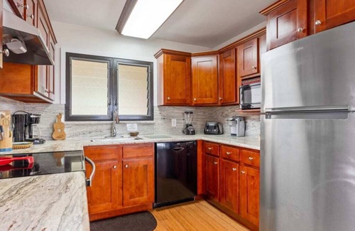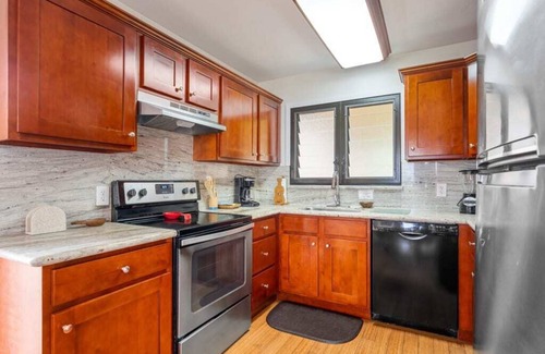 Castle Kaha Lani Resort #212, on the second floor: Guests can begin their day enjoying a fresh pot of coffee or blending local fruits in their blender. The inviting recently remodeled full kitchen has ample granite countertop space to prepare fantastic meals and feature solid wood cabinets. In addition, this kitchen has stainless-steel appliances such as a refrigerator, microwave, oven, stovetop, cookware, dishware, and toaster so all guests can begin the day with their must-haves. When it is time to explore, it's convenient and easy to put all dirty dishes in the dishwasher!