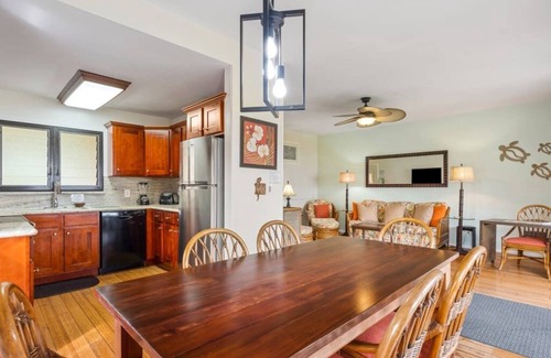 This condo offers guests privacy as it has a bedroom on each level, each with a recently upgraded bathroom. The master bedroom is located on the main level and has a king bed, and the upper level has the second bedroom with a queen bed. Both rooms offer guests drawers to unpack and settle into vacation mode. Both rooms are decorated tastefully with Hawaiian ocean and tropical themes like pineapple lamps, palm trees, and local flora paintings. Each bathroom has plenty of space for toiletries and includes a shower, tub, and basic shower needs.