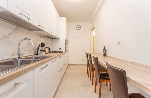 Both bathrooms are well-appointed with walk in showers and all necessary amenities for a comfortable stay. The fully equipped kitchen includes an stovetop, washing machine, Nespresso coffee machine, toaster, and kettle, facilitating the preparation of delicious home-cooked meals. Additionally, there's a convenient service balcony attached to the kitchen.
