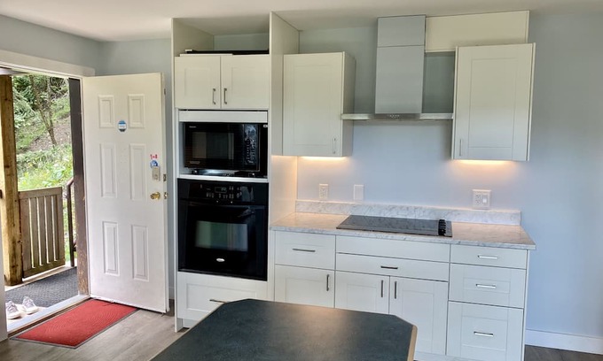 This pet-friendly suite includes a private hiking trail leading to the oceanfront, complete with a private picnic area and beach access. Large Fridge, Washer and dryer, WiFi, and utilities, providing a hassle-free living experience. Enjoy the convenience of free parking for 2 cars.