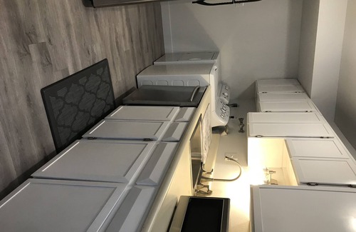 The guest bedroom features a desk, chair and lamp for working remotely, with a new Maytag washer and dryer included in the unit for convenient laundry.