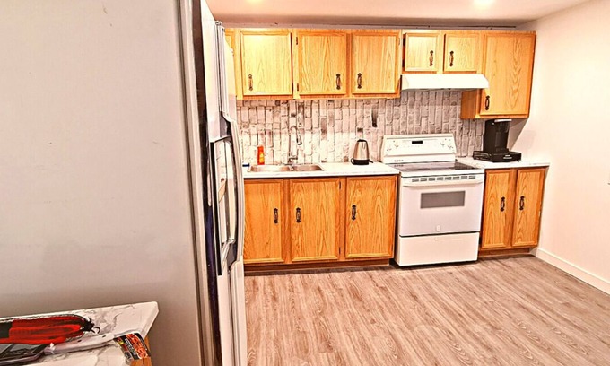 The basement unit is designed with your comfort and privacy in mind. It features two private bedrooms, each furnished to provide a restful retreat after a day of exploration or work. The shared living room space is perfect for relaxing, featuring comfortable seating and a warm, welcoming ambiance.