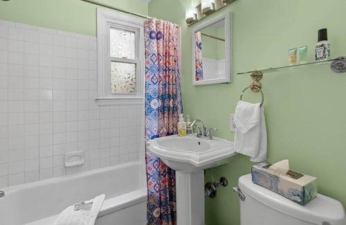 The home features a single bathroom with a shower, tub, sink, vanity, hair dryer in laundry closet, and toilet. Complimentary hand towels, bath towels, shampoo, conditioner, hand soap and toilet paper are available.