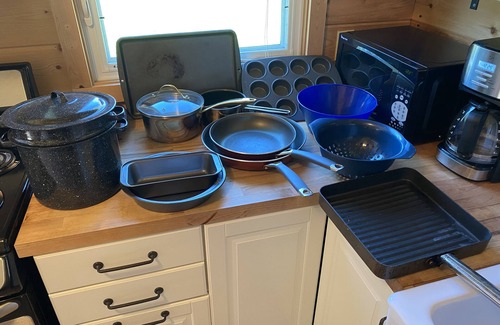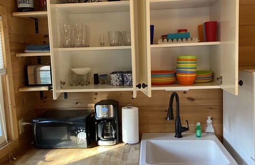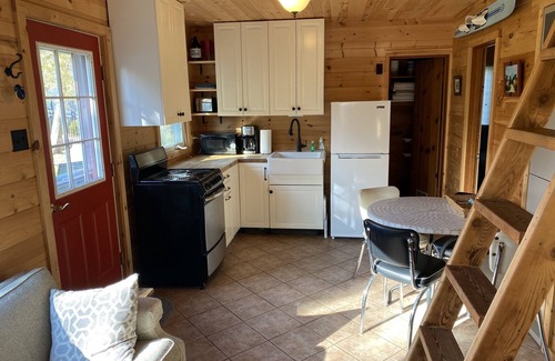Your cabin includes bath and bed linens, a fully equipped kitchen and your own beach space, 5 Kayaks with paddles and life vests, 12' rowboat, Swim Raft with your own beach chairs and fire pit. your own outdoor area with tables, chairs, grill and charcoal chimney starter.