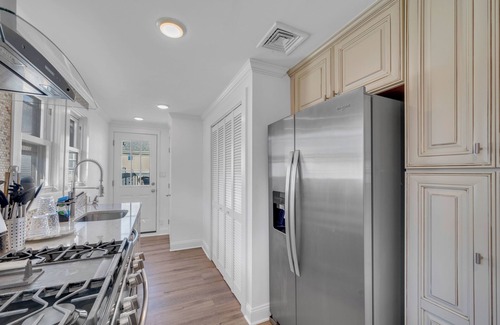 Modern beach home recently renovated just steps to the ocean! You will love this home with all the amenities for luxurious beach living. This unique home features separate living areas; perfect for two families who want privacy and extra space but want to be under one roof! The upstairs has 2 bedrooms, one bathroom, a bright and sunny front porch, modern living room with flat screen smart tv and comfortable furnishings. The modern kitchen is fully stocked with pots, pans, utensils, glassware, and full appliance package. Large bedrooms are a plus, and beautiful hardwood flooring throughout makes cleaning a breeze. The lower unit has a separate entrance and features two bedrooms, one bathroom, a den, livingroom, and modern kitchen. 4 beach badges included for upper unit and 4 badges for lower unit, gas grill, and a great rear yard perfect for entertaining!