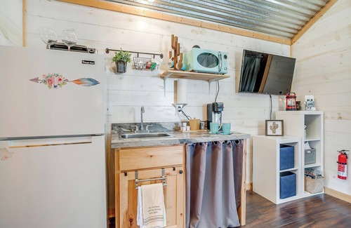 Another cozy 300-square-foot cabin perfect for couples or individuals, offering a queen-sized bed, a daybed with a twin trundle, a kid's loft with ladder access, a full-sized refrigerator, and a full bathroom. The kitchenette includes a refrigerator, Keurig coffee machine, electric cooktop, toaster, and microwave. Cactus Cottage sleeps 2 adults and 4 children.