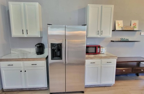 Discover this 2-bedroom gem in San Antonio. This pleasant house features 2 king beds, a cozy living room, and a fully equipped kitchen. Enjoy the peaceful quiet home with oversized driveway and privacy fenced backyard. The bathroom includes an oversized shower and a bidet for added comfort. An excellent choice for guests looking for a relaxing stay in the heart of the city. DT, Riverwalk, Convention center, alamodome, AT&T Frost Bank, just 2 or 3 miles away. Lackland AFB is about 9 miles and Ft. Sam Houston about 3 miles.