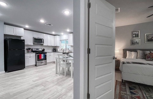 Welcome to our newly updated Airbnb! Experience ultimate comfort and convenience with a fully-equipped kitchen and a spacious dining area that accommodates all your guests. Unwind in the inviting living room, complete with a large SmartTV for relaxation. The main house features three beautifully appointed bedrooms, including a master bedroom with a luxurious ensuite bathroom and a king bed, a second bedroom with two double beds, and a third bedroom with a twin-over-twin bunk bed. Additionally, the casita offers an extra bedroom with a queen bed, a kitchenette, and a full bathroom for additional living space. Step outside and enjoy the large backyard with cozy patio seating. Stay connected with free wifi, and bring your furry friend along for a fee. Indulge in a memorable stay at our pet-friendly oasis!
