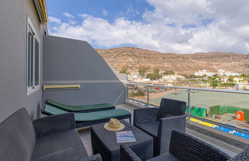 Located at the back of a residential building located on the 1st line of Playa de Mogán. It has a large terrace with mountain views and a rest area.
