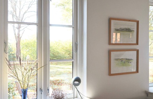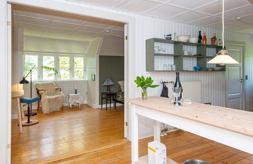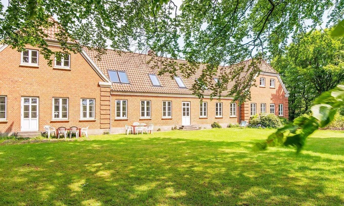 This large and well-appointed cottage is the former village school in Staby. The holiday home, which is designed for 20 people, is located calmly and peacefully with a view of fields to one side - and to the other offers a courtyard and a large natural plot, surrounded by beech hedges. Life is enjoyed in a closed and flourishing oasis. The organization of the house provides an opportunity for community, but also for people to retire. The building is certified worthy of preservation and a true gem for a multi-generational holiday, a writing stay or a good change from a busy everyday life. The 250 m2 ground floor is divided into a contiguous eastern and western section. Seven of the rooms are over 20 m2. The heart of the house is the large fireplace room, which is also furnished with the house's common dining room and a well-equipped kitchen with two ovens m.m. In the adjoining TV room there is also a well-tuned Hornung and Møller grand piano. In addition, & # 8217; East & # 8217; of three bright rooms & # 8211; all equipped with double beds. In addition, there are two smaller bathrooms with underfloor heating. & # 8217; Vest & # 8217; is a separate apartment with three bedrooms with double beds and two living rooms - equipped with large work table, wood stove and panoramic window to the west with a wonderful afternoon and evening light. In this department there are two large bathrooms. From both east and west there is access to the house's large southern lawn surrounded by powerful beech trees. On the first floor to the south / west, another independent apartment offers itself with a bright and cosily furnished living room with day-bed and dining table. There is open access to a smaller kitchen, and in connection with the living room there is the possibility of two extra beds in alcove-like interiors. In addition, there are three large rooms - with new double beds and desks. There is also access to the bathroom incl. shower on the first floor. The tranquility spreads accompanied by the view and the many incidents of light. Utility room with washer and dryer. The cottage is i.a. also equipped with free, wireless