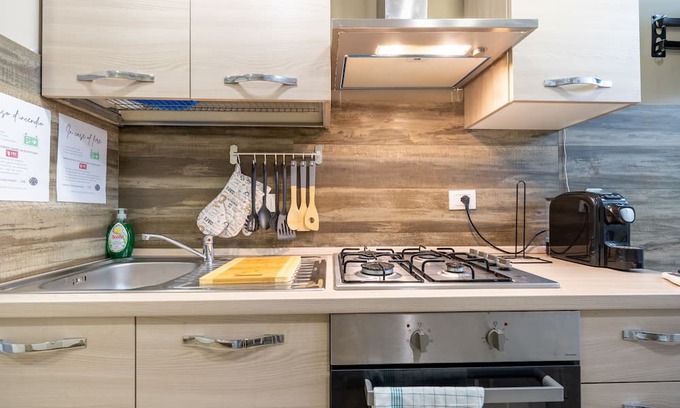 Once you open the front door, you are greeted by the living area, whose partially "trompe-l'œil" style and LED technology recessed lighting points are accompanied by a kitchen suitable for all kinds of culinary needs, a dining table, a very comfortable and elegant sofa bed for 2 people, a Smart TV with a swivel stand and access to Netflix. To top it off, coffee lovers will be able to enjoy excellent coffee from an ancient Piedmontese roasting plant using our coffee machine together with our coffee pods.