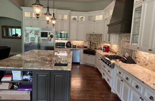 Enjoy the 2024 solar eclipse from the comfort of an English style Tudor. Enjoy this luxury home with 4000 square feet of heated and cooled area, 4 bedrooms and 5 full baths. It includes a large game room with fireplace and covered patio with an outdoor fireplace and grill. All bedrooms have their own bathroom with an additional full bath in the hallway near the laundry room and garage. The open concept kitchen, living and dining areas are great for hosting large family or corporate gatherings. Large flat screen tv's in the living and game rooms. The master bedroom and bathroom include a large walk in style shower with a rainfall shower head.