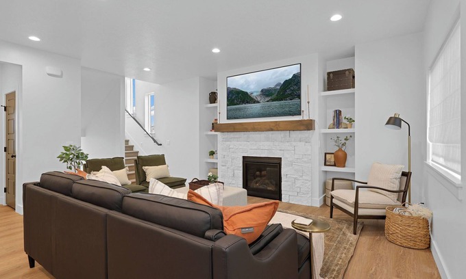 Luxe Living Spaces: The open-concept living area features a cozy gas-log fireplace, making it the ideal spot to unwind. Whether you’re enjoying a board game night or watching a movie on the 75-inch Frame TV, this space is perfect for spending quality time together.