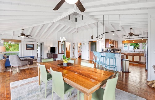 3 Bedroom home- 2 king master bedrooms with attached full bathrooms. One smaller sized room with a full size bed. A third full bathroom is directly outside the small bedroom.. This home has a large open kitchen/living/dining area, which is great for family gatherings as well as an attached rear Lanai (porch) with panoramic ocean and garden views. The home is fully appointed with a well stocked kitchen, High Quality linens, and comfortable island style furnishings. Amenities include high speed wireless, HD cable TV, phone with free long distance throughout North America (now also Canada and Mexico), Bose docking stereo, kids toys and books, Brand new Air Conditioning throughout, and much more (full list below) This home was completely updated in the beginning of 2022 so has all new furniture, fresh paint job, and concrete front patio with outdoor furniture and grill. We also provide coolers and beach chairs.