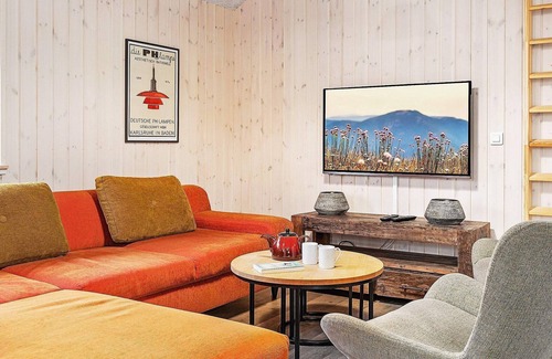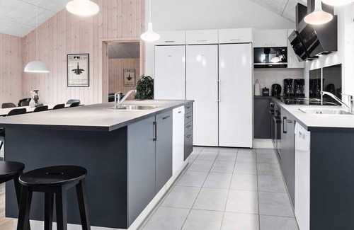 This well-appointed Skanlux activity house simply contains everything the heart can desire in terms of activity and development opportunities. The house is also suitable for family birthdays, confirmations, weddings and corporate events. And if you are very many, you have the opportunity to also rent one of the neighboring houses, which are also well equipped and furnished with many bedrooms. The large pool area contains a large swimming pool with counter-current system, underwater light and water slide, a sauna, a bathroom and a large whirlpool with room for 4-6 people. In the activity room, some can enjoy themselves at the bar, while others play a game of billiards at the pool table. Here you can also watch movies on DVD or challenge each other in table tennis, darts and table football or compete in various electronic games on Playstation4. The house is extremely spacious and well-dimensioned and built around 3 separate sleeping areas. Each sleeping area has a bathroom, in addition there is an extra bathroom in the swimming pool area. The single beds can be pushed together into a double bed. The dining / living area is tastefully decorated with stereo with CD player, flat screen TV, sofa area and wood burning stove. The kitchen is equipped with 2 ceramic hobs, 2 separate ovens, 2 refrigerators, 2 coffee machines and 2 dishwashers. The house has 9 bedrooms and 2 large and spacious sleeping lofts. There are box spring mattresses in all rooms and on the lofts. The house is heated by an energy-saving heat pump. Large, open sun terrace and covered terrace with barbecue - perfect for a cozy barbecue evening with family and friends. \ Be aware that the operation of the pool as well as the use of the upstream facility, sauna and spa leads to increased consumption of electricity and water. Depending on the season and use, a consumption of approx. 20 & # 8211; 30 Euro per day. Please note that photos are taken from similar house. *** Some houses are still being built in the area and close to the house. Therefore, there may occasionally be building nuisances such as. noise and dust. *** *** Important information: De