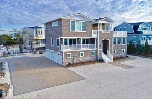 Beautiful home 3rd from the beach. There is a stunning granite kitchen with custom cherry cabinetry, a built-in refrigerator, convection microwave, Thermador cook top, and Kitchen Aid appliances. The home has 3 living areas-one on each floor, an elevator, 5 bedrooms, and 4 full and 2 half baths. Ocean views from both the main and roof-top decks. In addition to the beds listed above, there is also another queen sofa bed. Property rents Friday - Friday (avoid all that Saturday rental traffic). No smoking please. The beach badges are provided as a courtesy by the owner, but cannot be guaranteed. BRAND NEW FOR 2023 HEATED INGROUND POOL.
