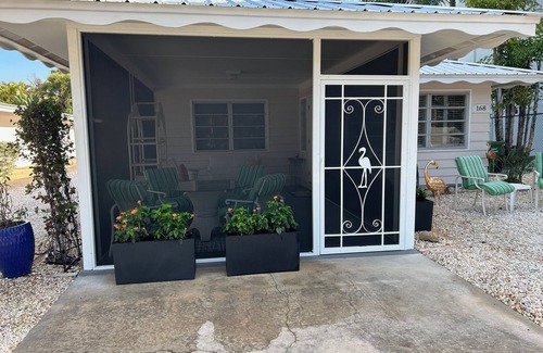 Flamingo Cottage takes you back in time with charm and modern day comforts galore. The screened Florida Room welcomes you home with over 500 square feet of comfy, dry, bugless outdoor space! The main living area has comfy leather furniture and desk, a 65" smart TV (with DVD player), which is open to dining room and kitchen, plus a "smart" 42" TV in the King bedroom. The back patio is complete with 2 modern chaise lounges with side tables, a large table and chairs for 6, solar lighted large umbrella and a Weber BBQ grill (propane provided). A relaxing propane fire pit is also at your private disposal, complete with comfortable seating for evening viewing of the stars.