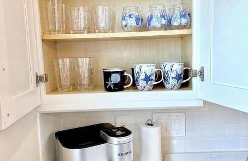 Our Kitchen is stocked with dinnerware, flatware, cookware and small appliances and accessories from Staub, Cuisinart, Williams Sonoma, Kitchen Aide, All Clad, Le Crueset, Chicago Cutlery & Mikasa. In addition, our villa contains a single use/12 pot Keurig Coffee Maker.