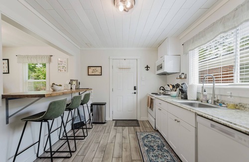 A fully equipped kitchen, coffee maker and Keurig, blender, toaster, a dining table to enjoy your meals. A bar seating area is also available.