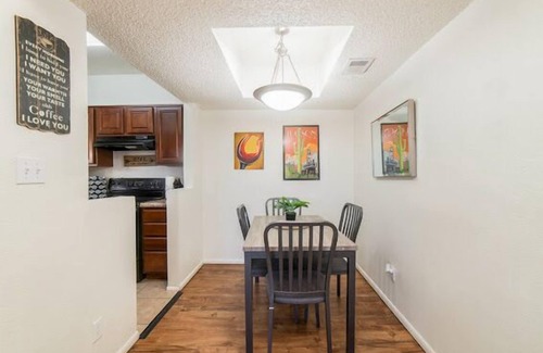 Walk to a morning coffee shop, local eatery, or hop a 5-min rideshare to UofA from my private 2BR second-story condo in the popular, bustling Hedrick Acres neighborhood. Fully furnished and stocked kitchen, 12" Green Tea memory foam mattresses, a quaint back patio, a community washer/dryer in the clubhouse, and steps to the jacuzzi and pool. Smart TVs with Netflix, or log in to your personal streaming services...and everything else you’ll need for your sunny snowbird vacation, travel nursing assignment, or shorter visit.